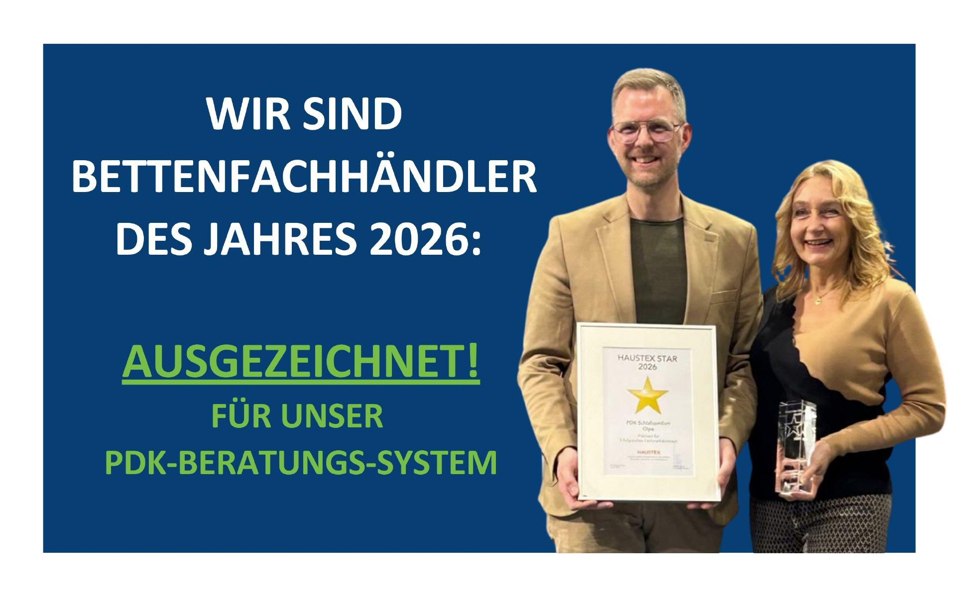 2026 Am 14.Januar 2026 wird unser Familienunternehmen bereits zum vierten Mal für sein "Vorbildliches Fachmarktkonzept PDK Schlafcomfort" auf der Internationalen Heimtextilmesse in Frankfurt am Main zu Deutschlands Bettenfachhändler des Jahres 2026 ausgezeichnet.