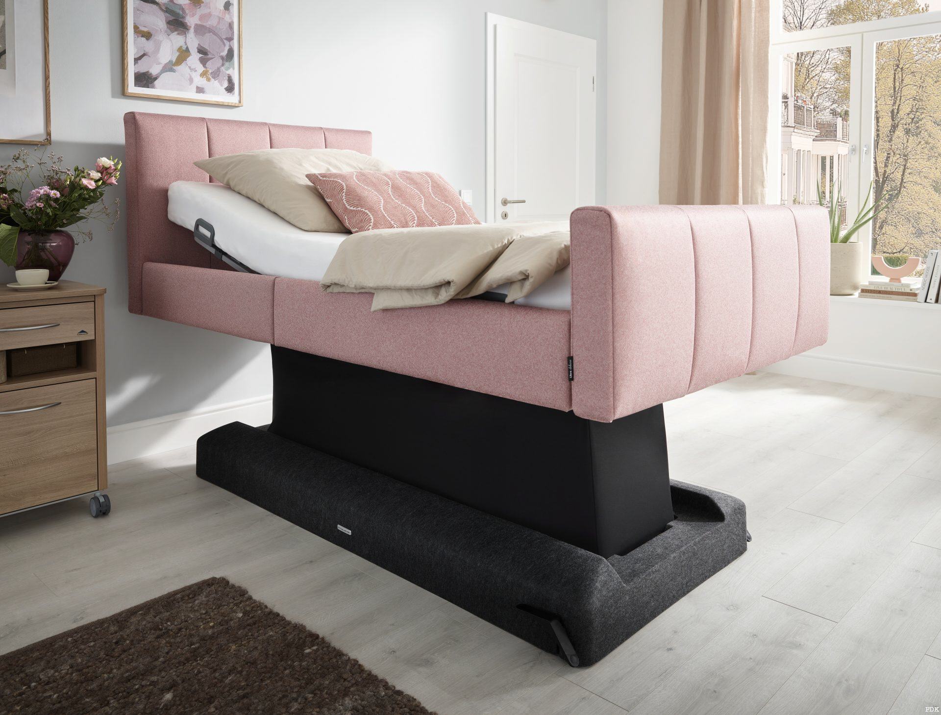 Das Libra Komfortbett verfügt über eine praktische Liftmechanik, die dafür sorgt, dass das Bett in der Höhe ganz nach Belieben verstellbar ist. So erleichtert es das Zubettgehen oder Aufstehen, das An- und Auskleiden, ist aber zugleich auch rückenschonend im Alltag, z.B. beim Sortieren der Wäsche oder dem Packen der Koffer für die nächste Reise. Selbst im Pflegefall ist es ein treuer Begleiter, da es die häusliche Pflege durch Ihre Lieben oder einen mobilen Pflegedienst weiterhin im eigenen Bett ermöglicht.
